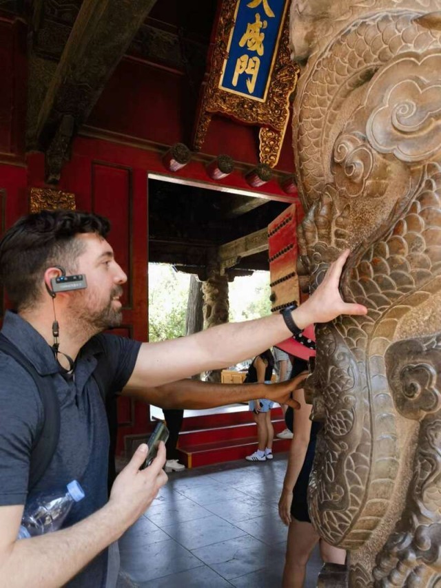 山东曲阜的孔庙大成殿龙柱前,来自佐治亚理工学院的研究生卡洛斯·伊拉赫塔感慨于整石雕刻的精美工艺。中青报·中青网记者 邢婷 摄