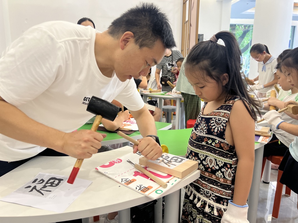 此外,在暑期研学中,孩子们通过编织棕叶孔雀,进一步了解传统手工艺的环保理念,雕刻“福”字时体悟民俗内涵——这种“做中学”的方式,让非遗从书本符号变成了可创作的文化载体。